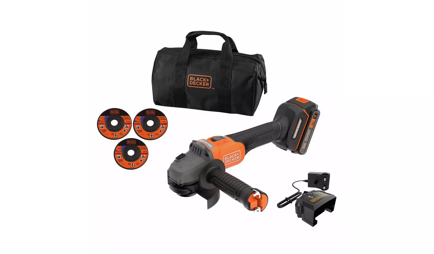 ready to work with 3 × 115 mm cutting discs, a battery, charger and a soft bag.